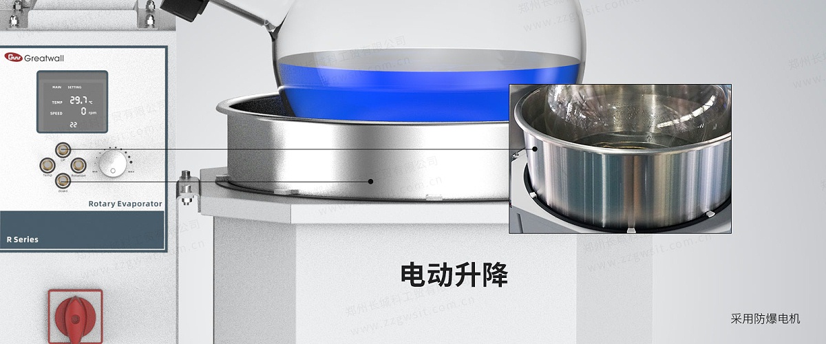 旋轉蒸發儀適用于生物、醫藥、化工、食品等領域的中試級實驗。與真空泵、循環冷卻器等冷卻設備組成配套系統。電機、加熱器、電氣控制箱均為防爆型,防爆標志: Ex db IIB T4 Gb,電動升降,RS485接口,標準Modbus RTU通訊協議。